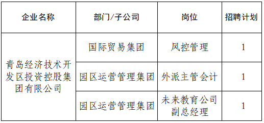 为满足集团业务发展需要,青岛经济技术开发区投资控股集团有限公司现面向社会公开招聘工作人员3名,具体招聘公告如下: