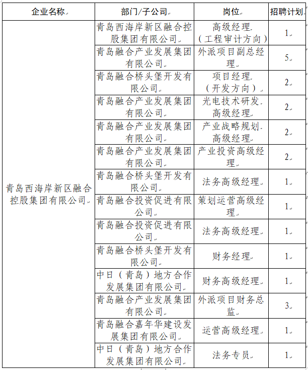 为满足集团业务发展需要,青岛西海岸新区融合控股集团有限公司现面向社会公开招聘工作人员24名,具体招聘公告如下: